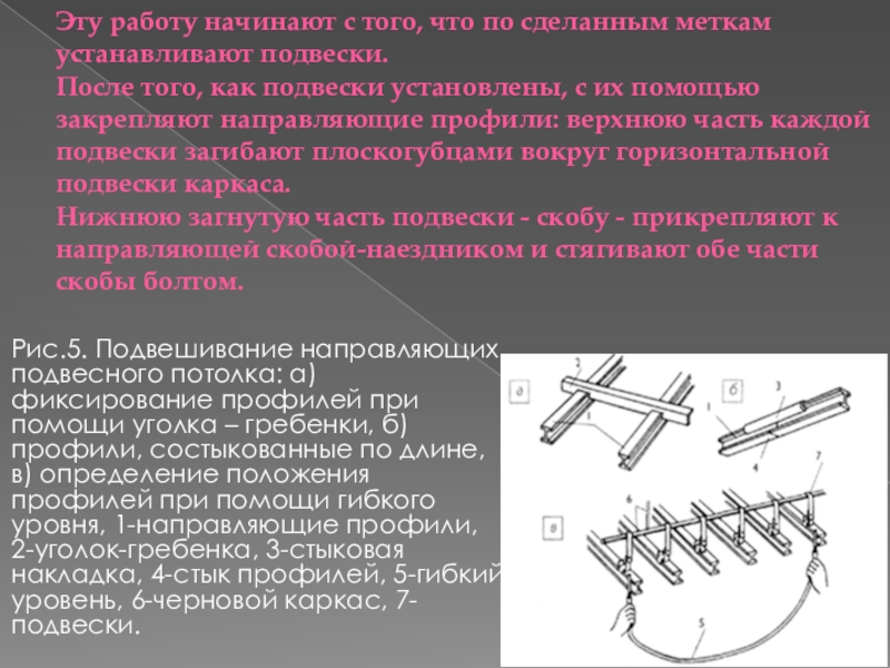 Рис.5. Подвешивание направляющих подвесного потолка: а) фиксирование профилей при помощи уголка – гребенки, б) профили, состыкованные по длине, в) определение положения профилей при помощи гибкого уровня, 1-направляющие профили, 2-уголок-гребенка, 3-стыковая накладка, 4-стык профилей, 5-гибкий уровень, 6-черновой каркас, 7-подвески.