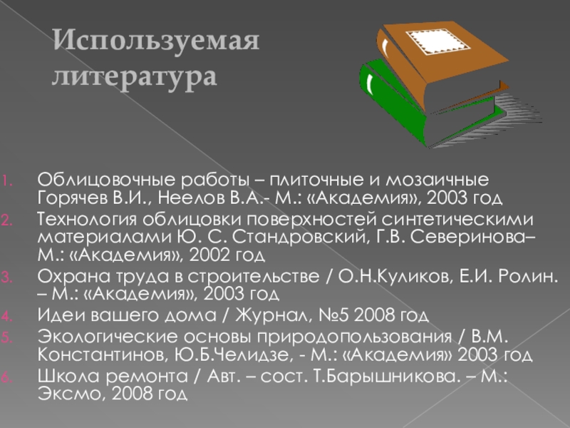 Технология облицовки поверхностей синтетическими материалами Ю. С. Стандровский, Г.В. Северинова– М.: «Академия», 2002 год