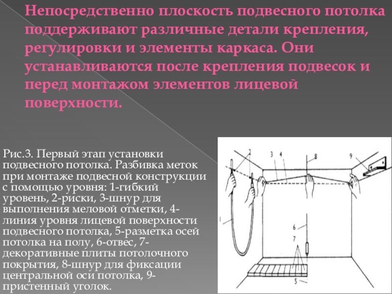 Рис.3. Первый этап установки подвесного потолка. Разбивка меток при монтаже подвесной конструкции с помощью уровня: 1-гибкий уровень, 2-риски, 3-шнур для выполнения меловой отметки, 4-линия уровня лицевой поверхности подвесного потолка, 5-разметка осей потолка на полу, 6-отвес, 7-декоративные плиты потолочного покрытия, 8-шнур для фиксации центральной оси потолка, 9-пристенный уголок.