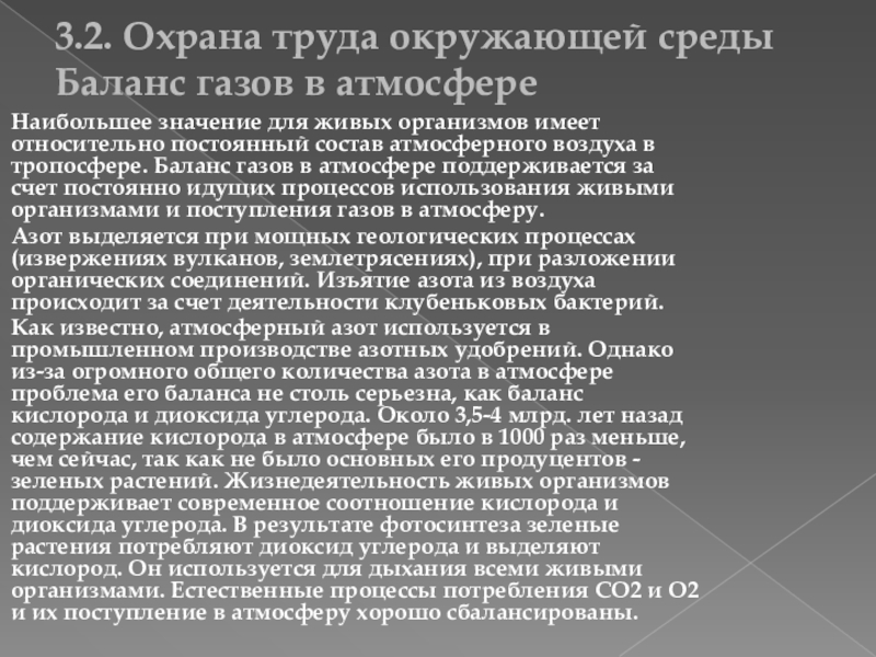 Как известно, атмосферный азот используется в промышленном производстве азотных удобрений. Однако из-за огромного общего количества азота в атмосфере проблема его баланса не столь серьезна, как баланс кислорода и диоксида углерода. Около 3,5-4 млрд. лет назад содержание кислорода в атмосфере было в 1000 раз меньше, чем сейчас, так как не было основных его продуцентов - зеленых растений. Жизнедеятельность живых организмов поддерживает современное соотношение кислорода и диоксида углерода. В результате фотосинтеза зеленые растения потребляют диоксид углерода и выделяют кислород. Он используется для дыхания всеми живыми организмами. Естественные процессы потребления СО2 и О2 и их поступление в атмосферу хорошо сбалансированы.