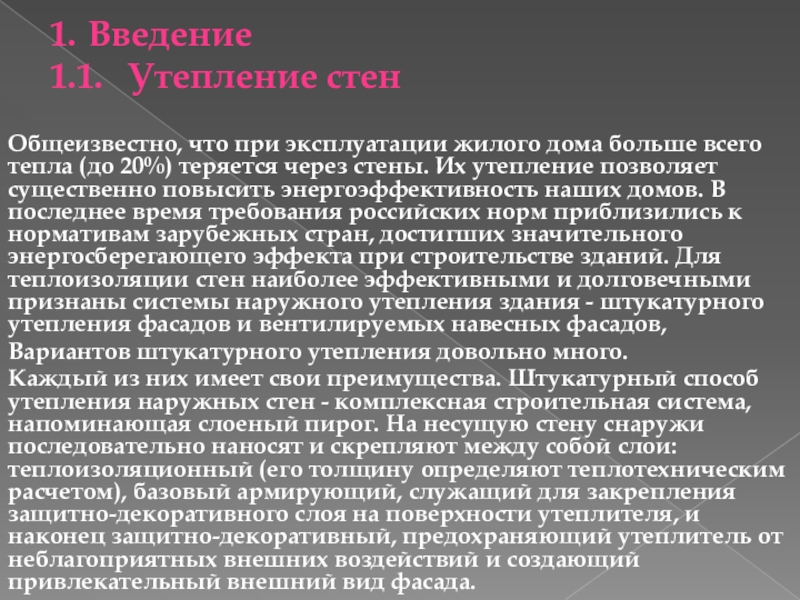 20%) теряется через стены. Их утепление позволяет существенно повысить энергоэффективность наших домов. В последнее время требования российских норм приблизились к нормативам зарубежных стран, достигших значительного энергосберегающего эффекта при строительстве зданий. Для теплоизоляции стен наиболее эффективными и долговечными признаны системы наружного утепления здания - штукатурного утепления фасадов и вентилируемых навесных фасадов,