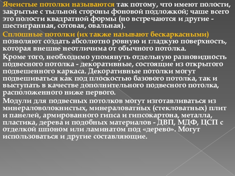 Слайд 8Ячеистые потолки называются так потому, что имеют полости, закрытые с тыльной