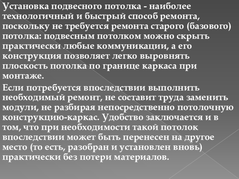 Слайд 6Установка подвесного потолка - наиболее технологичный и быстрый способ ремонта, поскольку