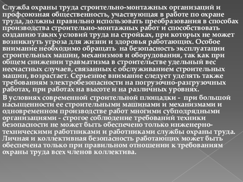 по охране труда, должны правильно использовать преобразования в способах производства строительно-монтажных работ и способствовать созданию таких условий труда на стройках, при которых не может возникнуть угроза для жизни и здоровья работающих. Особое внимание необходимо обращать на безопасность эксплуатации строительных машин, механизмов и оборудования, так как при общем снижении травматизма в строительстве удельный вес несчастных случаев, связанных с обслуживанием строительных машин, возрастает. Серьезное внимание следует уделять также требованиям электробезопасности на погрузочно-разгрузочных работах, при работах на высоте и на различных уровнях.