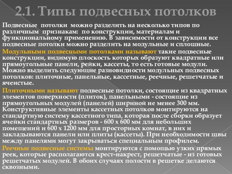 признакам: по конструкции, материалам и функциональному применению. В зависимости от конструкции все подвесные потолки можно разделить на модульные и сплошные.