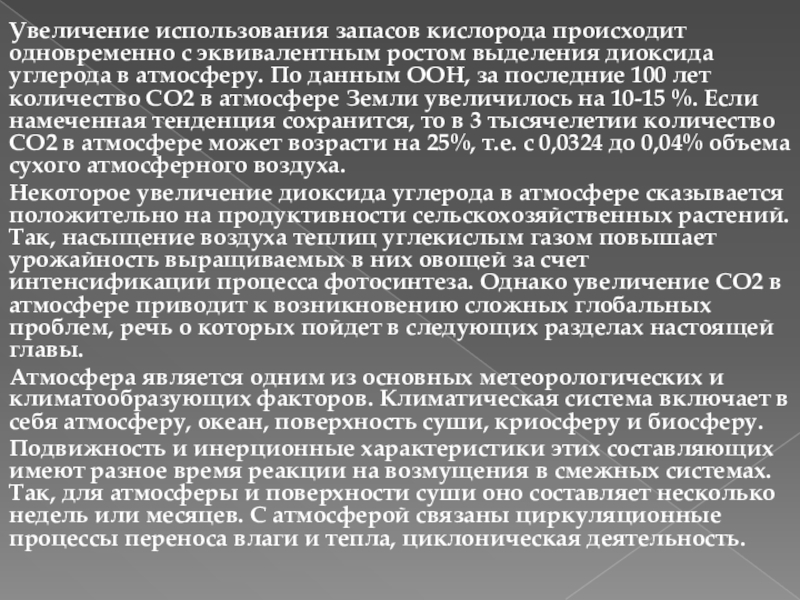 углерода в атмосферу. По данным ООН, за последние 100 лет количество СО2 в атмосфере Земли увеличилось на 10-15 %. Если намеченная тенденция сохранится, то в 3 тысячелетии количество СО2 в атмосфере может возрасти на 25%, т.е. с 0,0324 до 0,04% объема сухого атмосферного воздуха.