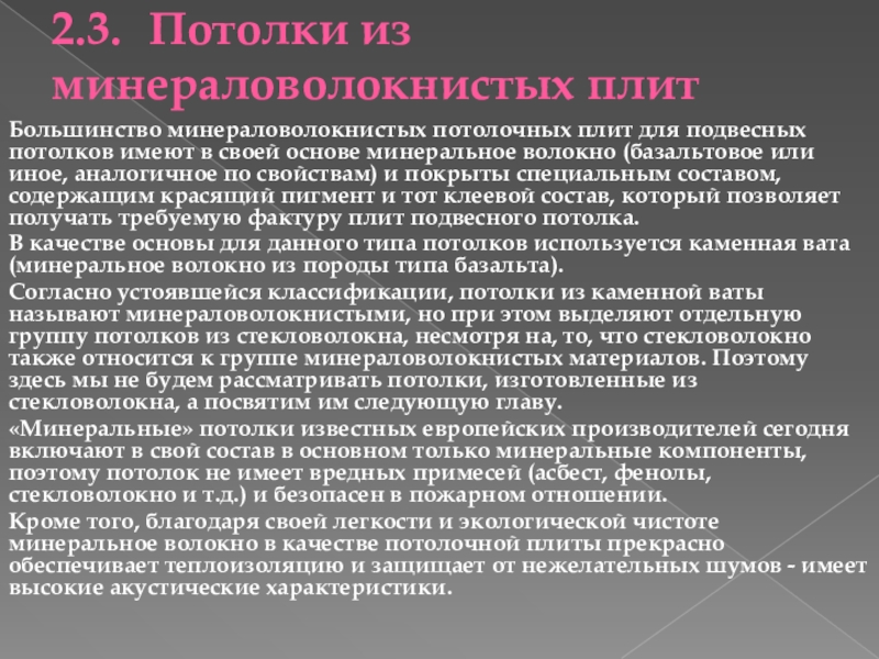 «Минеральные» потолки известных европейских производителей сегодня включают в свой состав в основном только минеральные компоненты, поэтому потолок не имеет вредных примесей (асбест, фенолы, стекловолокно и т.д.) и безопасен в пожарном отношении.