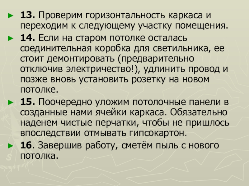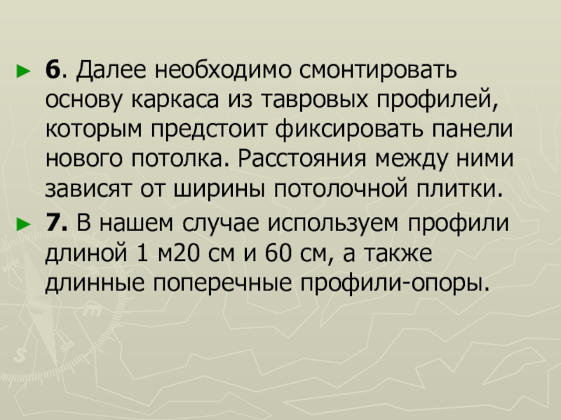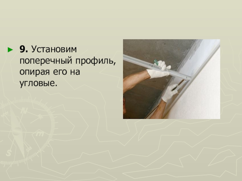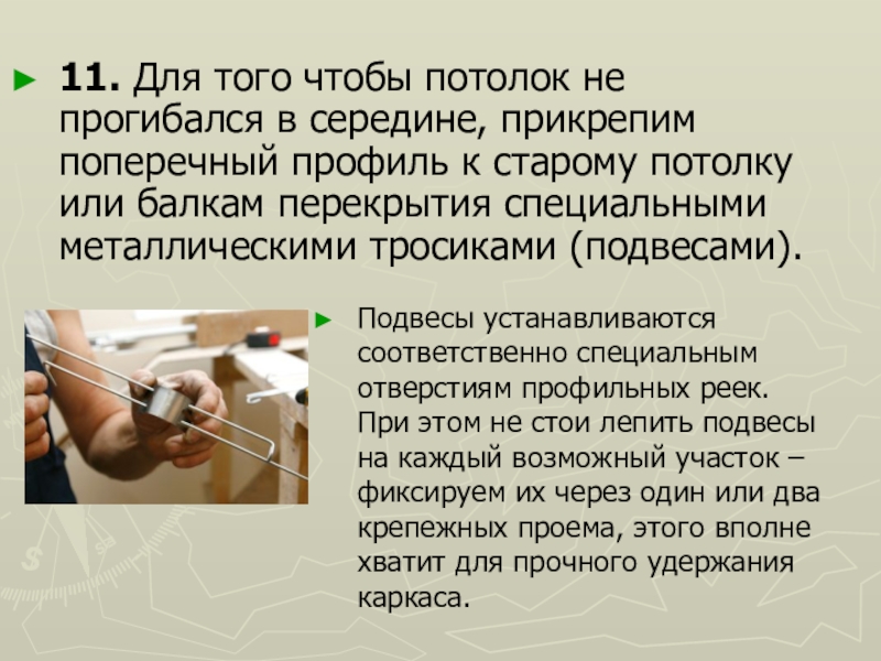 11. Для того чтобы потолок не прогибался в середине, прикрепим поперечный профиль к старому потолку или балкам перекрытия специальными металлическими тросиками (подвесами).