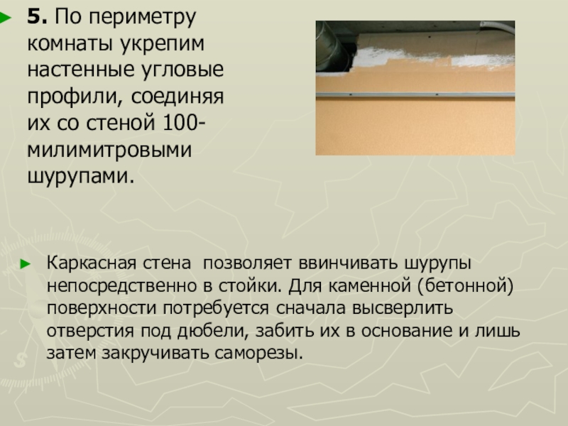 5. По периметру комнаты укрепим настенные угловые профили, соединяя их со стеной 100-милимитровыми шурупами.