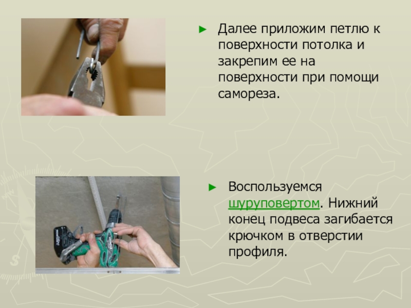 Воспользуемся шуруповертом. Нижний конец подвеса загибается крючком в отверстии профиля.