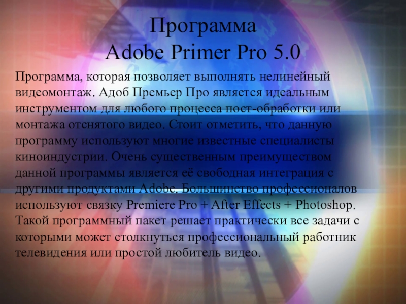 Программа  Adobe Primer Pro 5.0Программа, которая позволяет выполнять нелинейный видеомонтаж. Адоб Премьер Про является идеальным инструментом