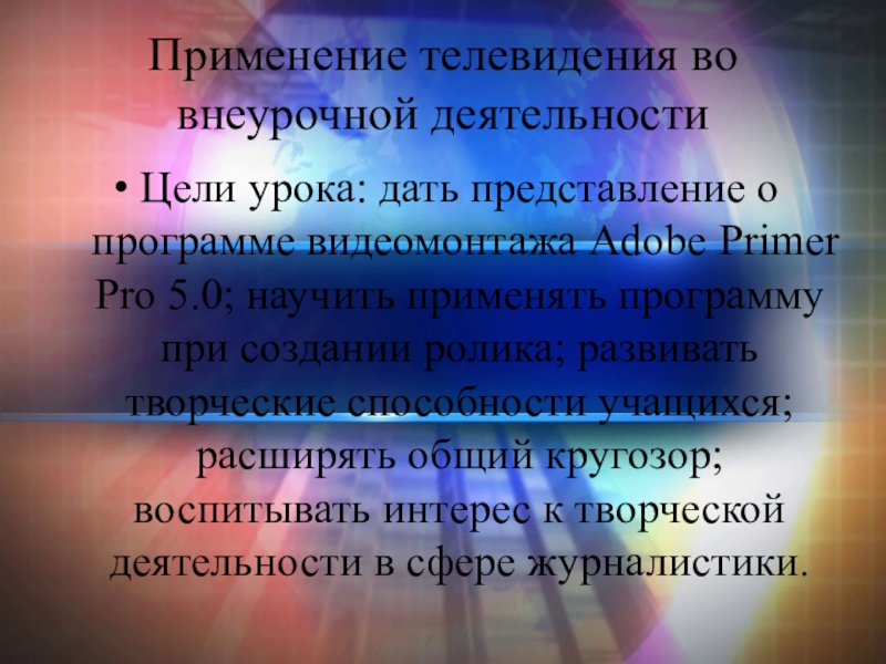 Применение телевидения во внеурочной деятельностиЦели урока: дать представление о программе видеомонтажа Adobe Primer Pro 5.0; научить применять