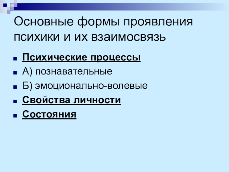 Основные формы проявления психики и их взаимосвязьПсихические процессыА) познавательныеБ) эмоционально-волевыеСвойства личностиСостояния