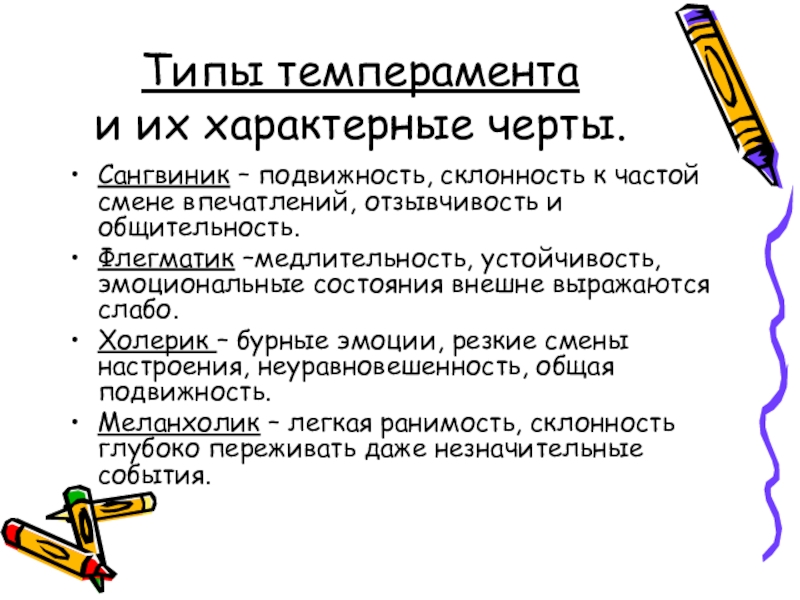 Типы темперамента  и их характерные черты.Сангвиник – подвижность, склонность к частой смене впечатлений, отзывчивость и общительность.Флегматик