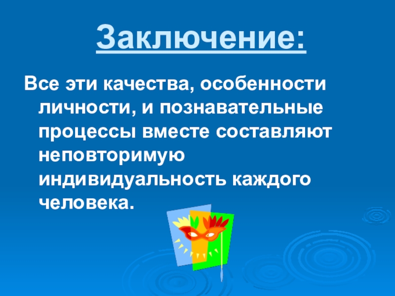 Заключение:Все эти качества, особенности личности, и познавательные процессы вместе составляют неповторимую индивидуальность каждого человека.