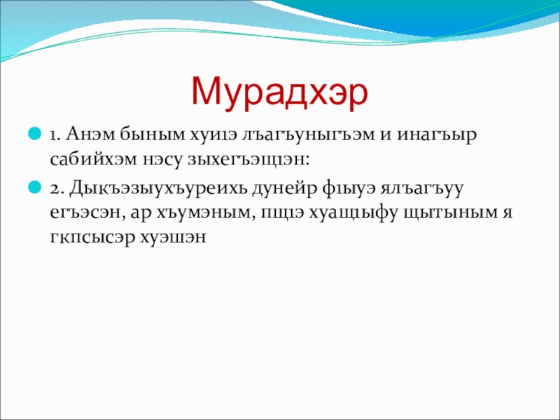 Мурадхэр1. Анэм быным хуи1э лъагъуныгъэм и инагъыр сабийхэм нэсу зыхегъэщ1эн:2. Дыкъэзыухъуреихь дунейр ф1ыуэ ялъагъуу егъэсэн, ар хъумэным,