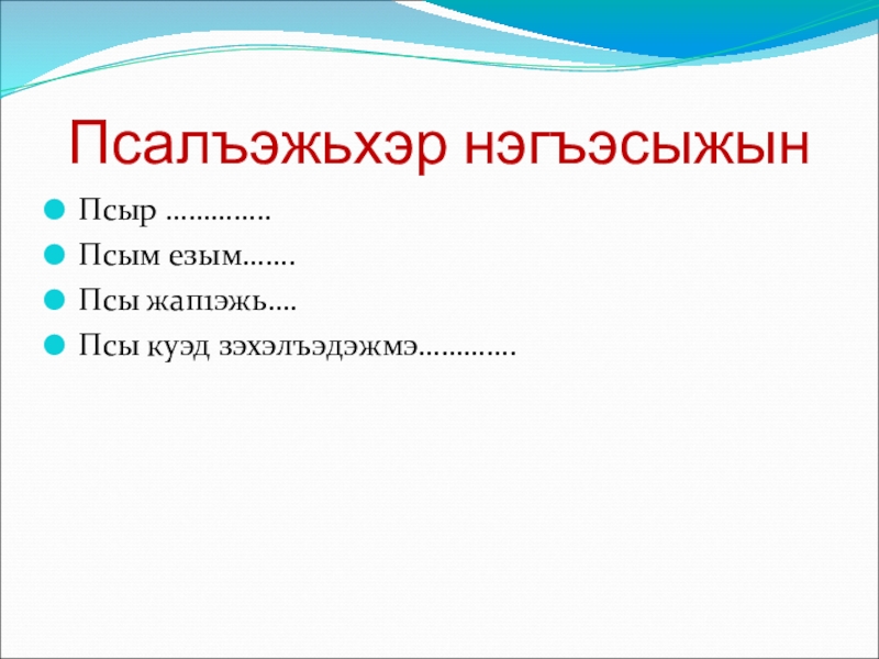 Псалъэжьхэр нэгъэсыжынПсыр …………..Псым езым…….Псы жап1эжь….Псы куэд зэхэлъэдэжмэ………….
