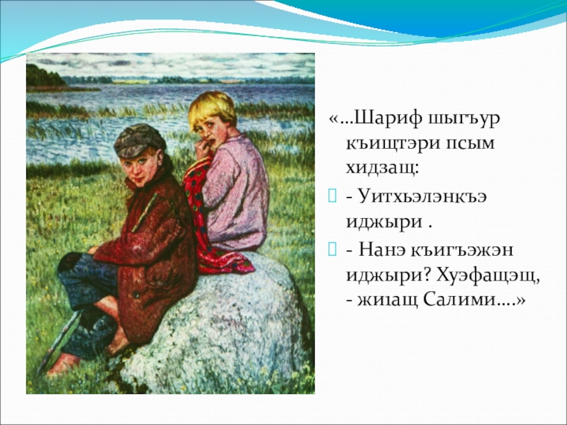 «…Шариф шыгъур къищтэри псым хидзащ: - Уитхьэлэнкъэ иджыри . - Нанэ къигъэжэн иджыри? Хуэфащэщ, - жи1ащ Салими….»