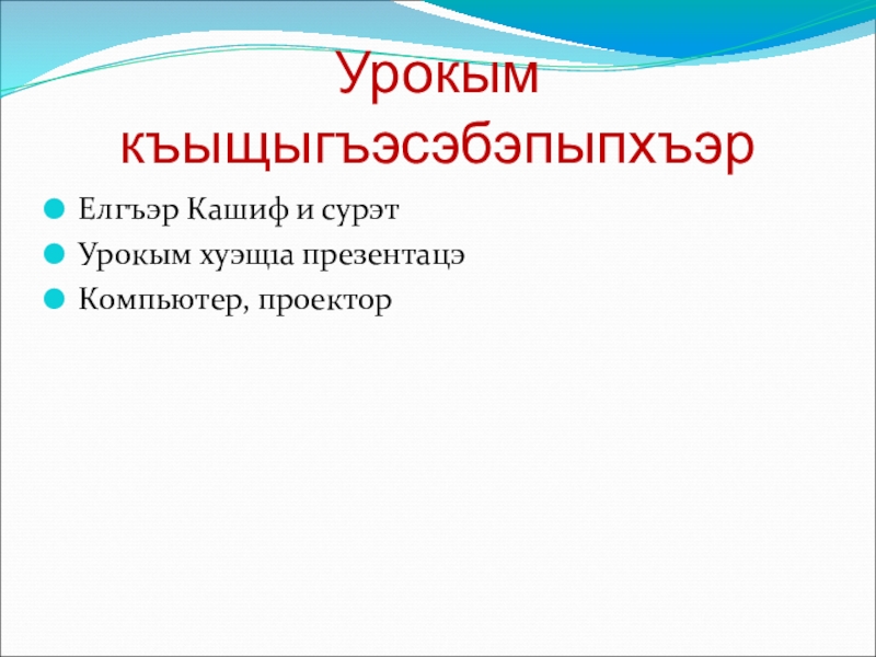 Урокым къыщыгъэсэбэпыпхъэрЕлгъэр Кашиф и сурэтУрокым хуэщ1а презентацэКомпьютер, проектор