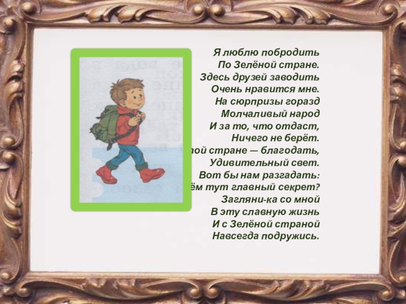 Я люблю побродить По Зелёной стране. Здесь друзей заводить Очень нравится мне. На сюрпризы горазд Молчаливый народ