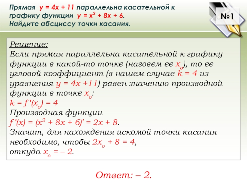 Если прямая параллельна касательной к графику функции в какой-то точке (назовем ее хо), то ее угловой коэффициент (в нашем случае k = 4 из уравнения у = 4х +11) равен значению производной функции в точке хо: