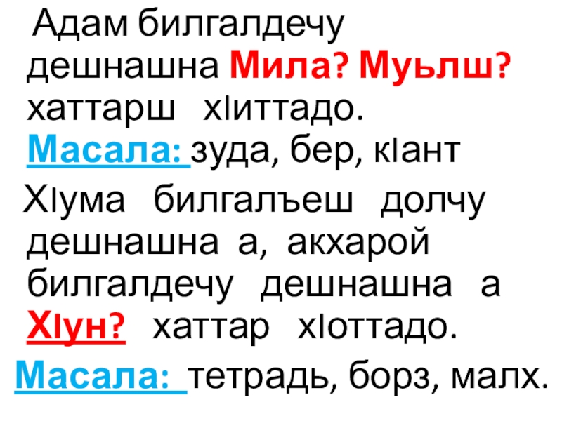 Слайд 18 Адам билгалдечу дешнашна Мила? Муьлш? хаттарш хIиттадо.