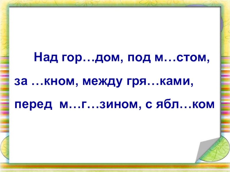 Слайд 2 Над гор…дом, под м…стом, за …кном, между гря…ками,