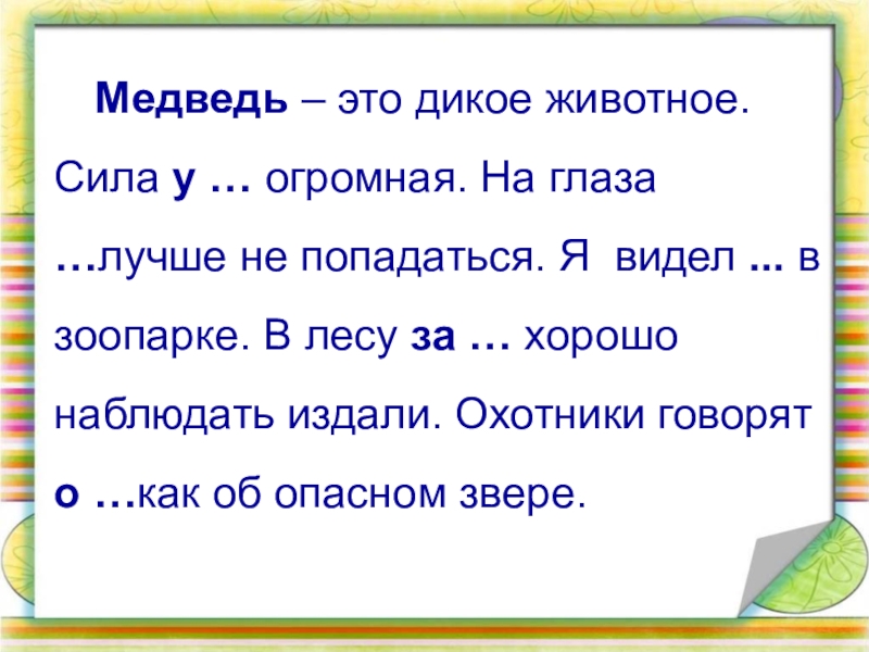 Медведь – это дикое животное. Сила у … огромная. На глаза …лучше не попадаться. Я