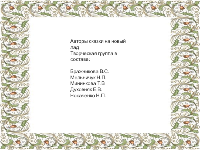 Авторы сказки на новый ладТворческая группа в составе:Бражникова В.С.Мельничук Н.П.Мининкова Т.ВДуховняк Е.В.Носаченко Н.П.