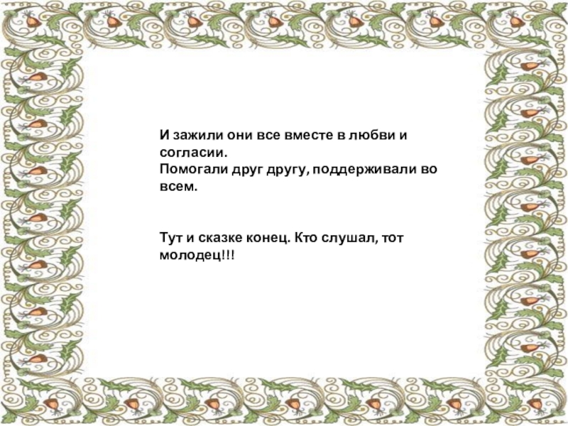 И зажили они все вместе в любви и согласии.Помогали друг другу, поддерживали во всем. Тут и сказке