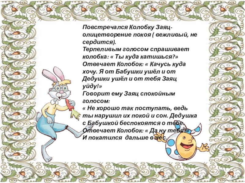 Слайд 4Повстречался Колобку Заяц-олицетворение покоя ( вежливый, не сердится).