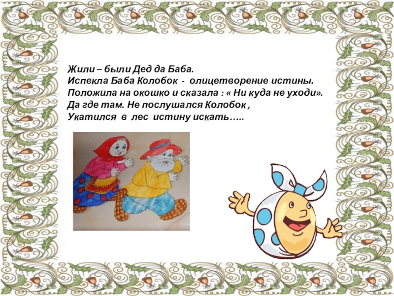 Жили – были Дед да Баба. Испекла Баба Колобок - олицетворение истины. Положила на окошко и сказала