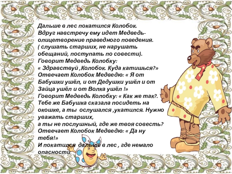 Дальше в лес покатился Колобок.Вдруг навстречу ему идет Медведь-олицетворение праведного поведения.( слушать старших, не нарушать обещаний, поступать