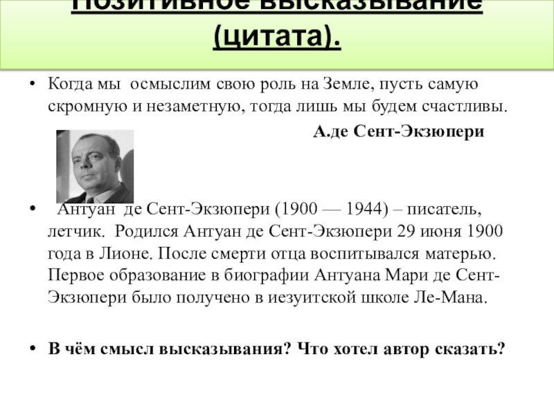 Антуан де Сент-Экзюпери (1900 — 1944) – писатель, летчик. Родился Антуан де Сент-Экзюпери 29 июня 1900 года в Лионе. После смерти отца воспитывался матерью. Первое образование в биографии Антуана Мари де Сент-Экзюпери было получено в иезуитской школе Ле-Мана.