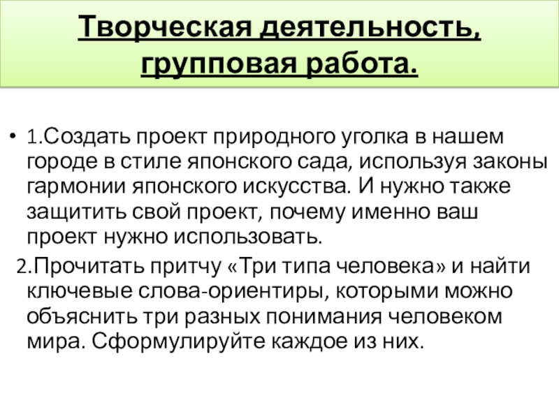 стиле японского сада, используя законы гармонии японского искусства. И нужно также защитить свой проект, почему именно ваш проект нужно использовать.