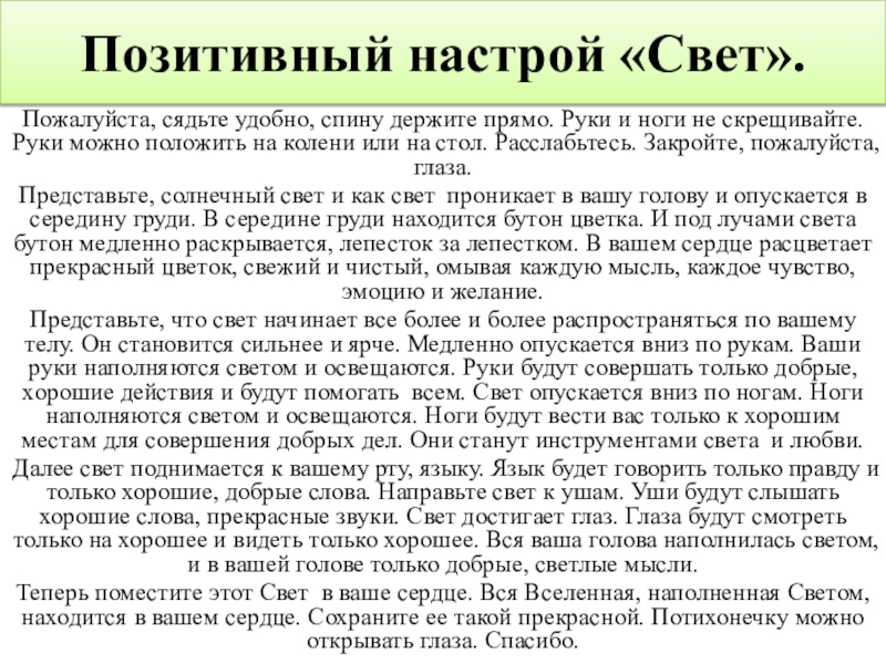 не скрещивайте. Руки можно положить на колени или на стол. Расслабьтесь. Закройте, пожалуйста, глаза.