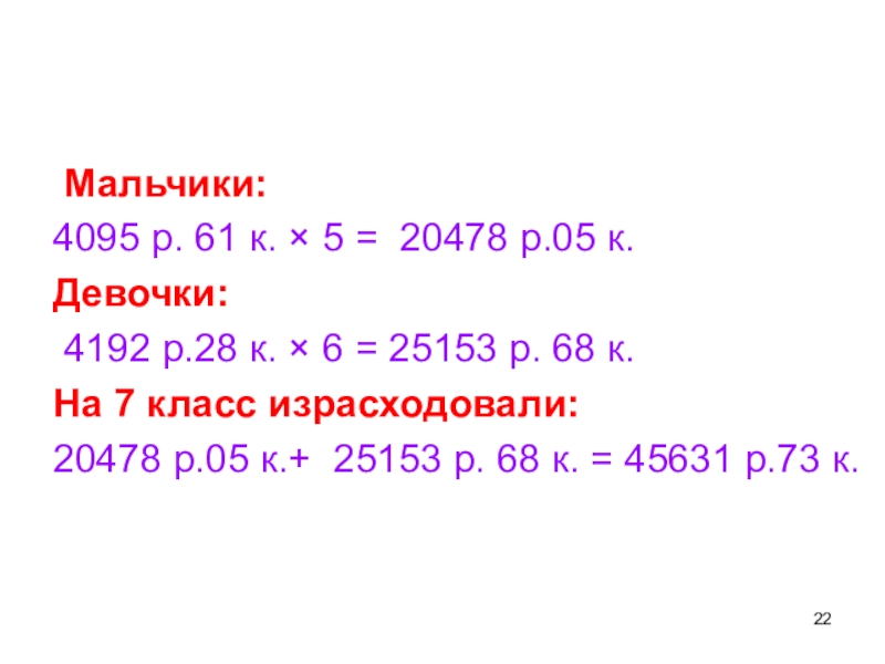 Мальчики:  4095 р. 61 к. × 5 = 20478 р.05 к.Девочки: 4192 р.28 к. ×
