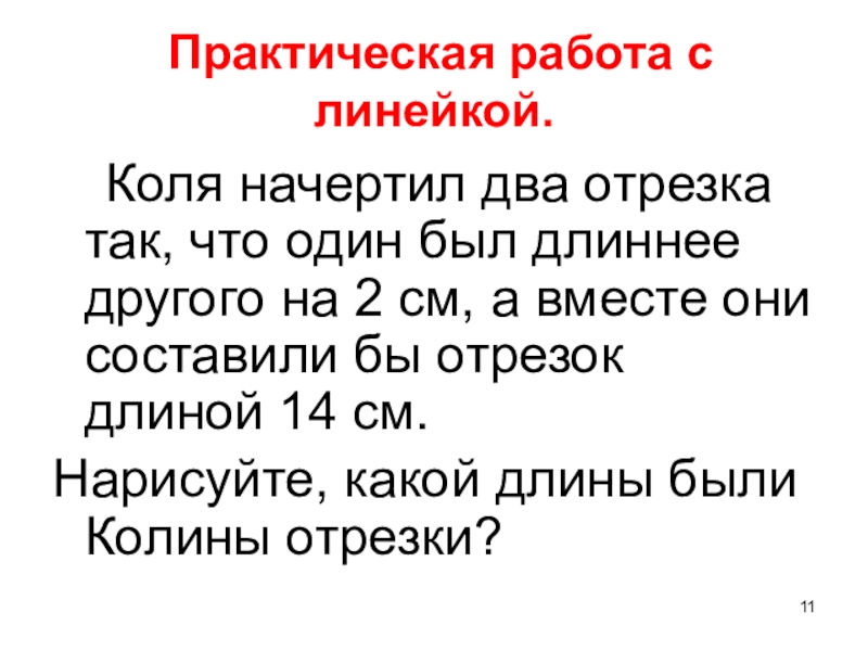 Практическая работа с линейкой.   Коля начертил два отрезка так, что один был длиннее другого