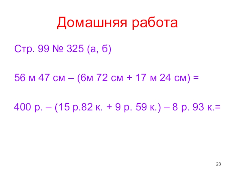 Домашняя работаСтр. 99 № 325 (а, б)56 м 47 см – (6м 72 см + 17 м