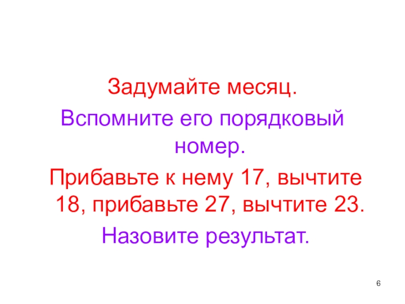 Задумайте месяц. Вспомните его порядковый номер. Прибавьте к нему 17, вычтите 18, прибавьте 27, вычтите 23. Назовите