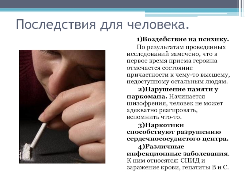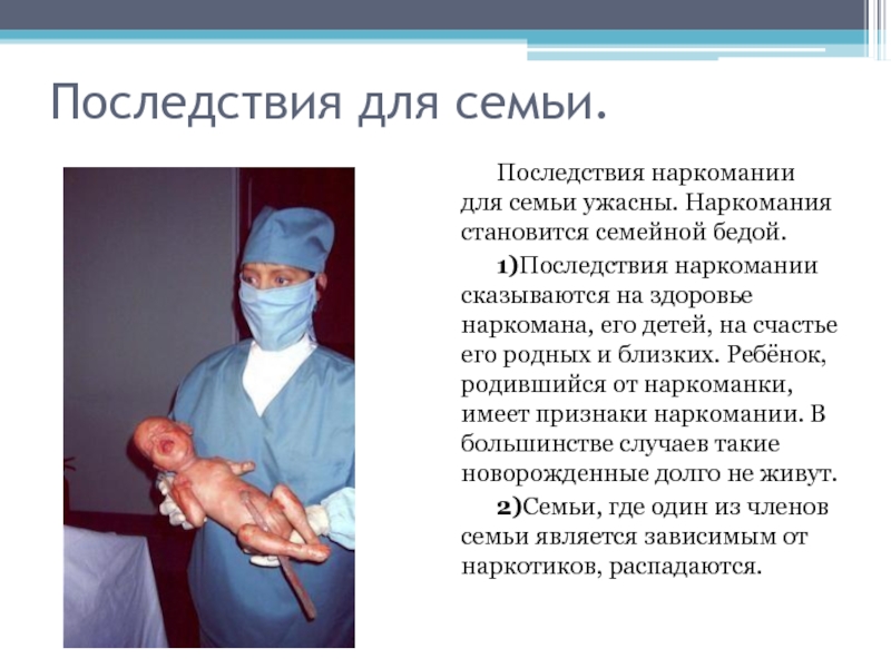 1)Последствия наркомании сказываются на здоровье наркомана, его детей, на счастье его родных и близких. Ребёнок, родившийся от наркоманки, имеет признаки наркомании. В большинстве случаев такие новорожденные долго не живут.