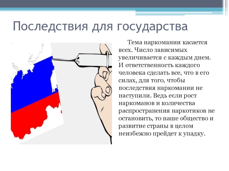 днем. И ответственность каждого человека сделать все, что в его силах, для того, чтобы последствия наркомании не наступили. Ведь если рост наркоманов и количества распространения наркотиков не остановить, то наше общество и развитие страны в целом неизбежно прейдет к упадку.