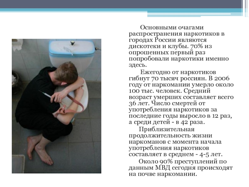 Ежегодно от наркотиков гибнут 70 тысяч россиян. В 2006 году от наркомании умерло около 100 тыс. человек. Средний возраст умерших составляет всего 36 лет. Число смертей от употребления наркотиков за последние годы выросло в 12 раз, а среди детей - в 42 раза.