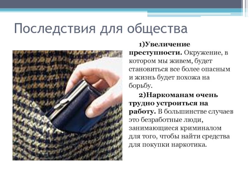 2)Наркоманам очень трудно устроиться на работу. В большинстве случаев это безработные люди, занимающиеся криминалом для того, чтобы найти средства для покупки наркотика.