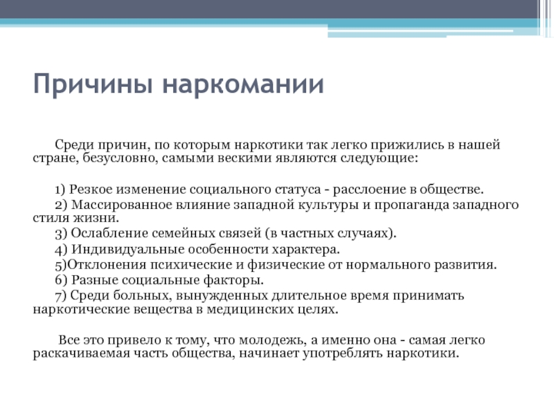 Все это привело к тому, что молодежь, а именно она - самая легко раскачиваемая часть общества, начинает употреблять наркотики.