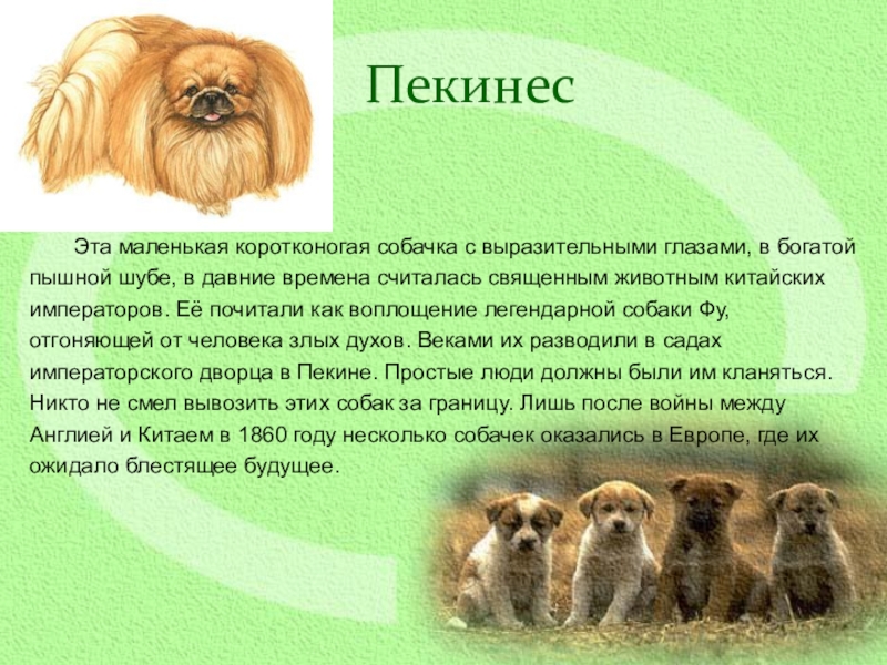 Пекинес 	Эта маленькая коротконогая собачка с выразительными глазами, в богатой пышной шубе, в давние