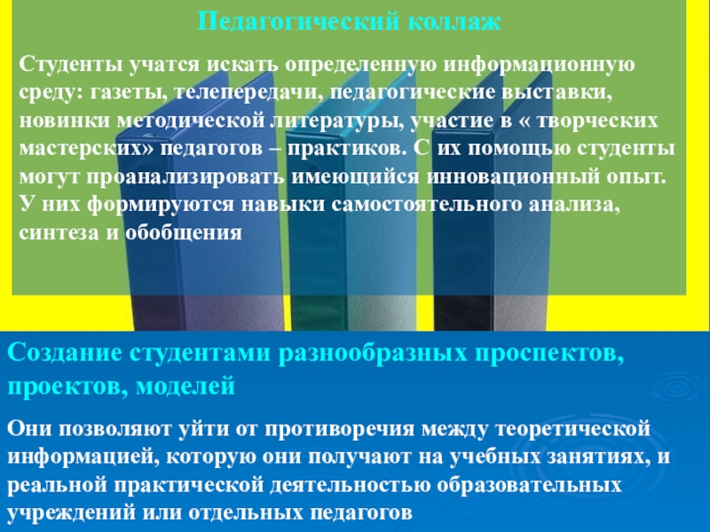 Они позволяют уйти от противоречия между теоретической информацией, которую они получают на учебных занятиях, и реальной практической деятельностью образовательных учреждений или отдельных педагогов