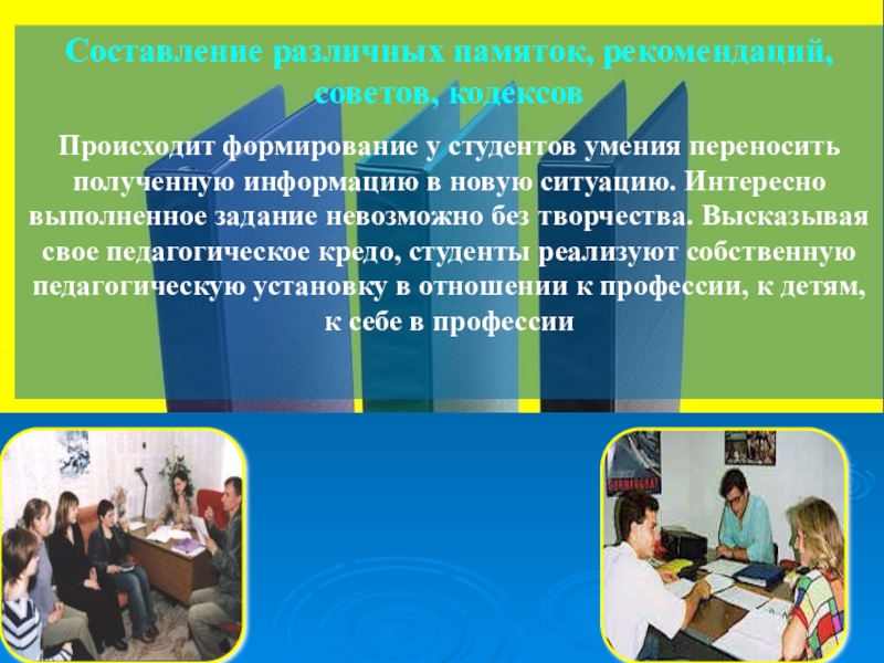 Создание «картотек методов, идей» Развивается умение обобщать, классифицировать педагогические явления, делать выводы и составлять на их основе методические рекомендации. Такая работа создает предпосылки для проявления студентами своей педагогической позиции, отношения к имеющемуся опыту.