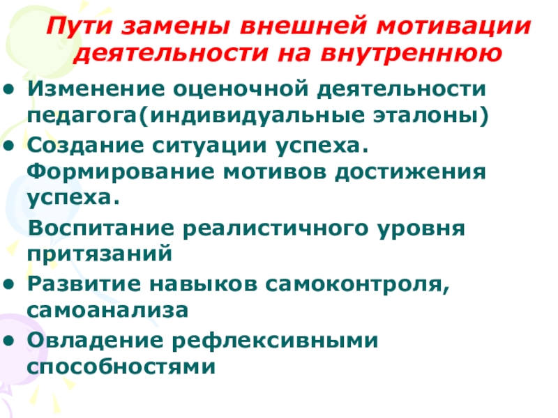 Слайд 15Пути замены внешней мотивации деятельности на внутреннюю