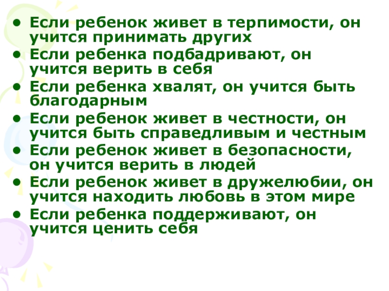 Слайд 8Если ребенок живет в терпимости, он учится принимать других
